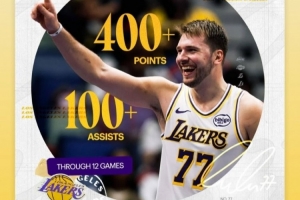 體育資訊11月26日訊 湖人當家球星盧卡·東契奇本賽季出戰(zhàn)12場已達成400分100助,成為NBA歷史首人。