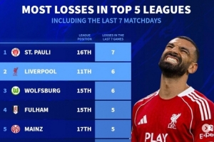 體育資訊11月26日訊 利物浦在本輪英超主場0-3慘敗諾丁漢森林,延續(xù)了近期糟糕表現,《轉會市場》也統(tǒng)計了五大聯賽近7輪輸球最多情況,利物浦位列次席。