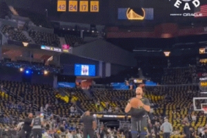 賽前熱身環(huán)節(jié),庫里秀了一把空接背扣,落地后還原地轉身耍帥,心情不錯。