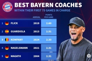 拜仁主帥執(zhí)教前75場場均拿分榜: