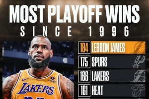 美媒BF曬圖,詹姆斯季后賽勝場數(shù)184場,超越1996年以來所有的球隊,球隊里排名前五的是:馬刺175場、湖人166場、熱火161場、凱爾特人157場、勇士118場。