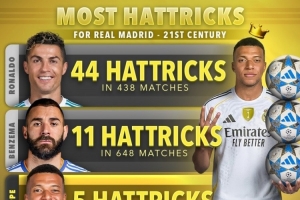 體育資訊11月29日訊 Score90統(tǒng)計了本世紀(jì)球員在皇馬上演帽子戲法的次數(shù),并列出榜單,C羅44次居首,本澤馬11次第二,姆巴佩5次。