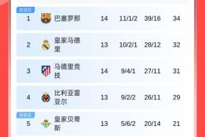 最新積分榜方面:先賽的巴薩憑借2分優(yōu)勢暫升榜首,排名第2的皇馬明日凌晨將客戰(zhàn)赫塔費(fèi),同樣先賽的馬競積分反超黃潛暫時(shí)來到第3。