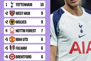 體育資訊12月1日訊 在本輪英超,熱刺主場1-2不敵富勒姆。OPTA盤點了2025年英超主場失利場次榜,具體如下: