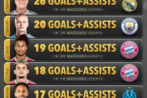 本賽季五大聯(lián)賽球員參與進球榜(所有賽事):