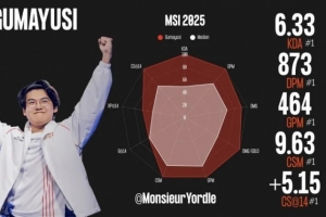 體育資訊7月12日訊 2025MSI T1 vs AL敗者組決賽賽前,外網(wǎng)數(shù)據(jù)博主更新Gumayusi選手本次MSI數(shù)據(jù),KDA、分均傷害、分均經(jīng)濟、分均補刀、14分鐘補刀領先均位居第一。