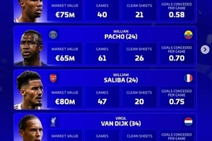 薩利巴(阿森納,24歲,法國):身價8000萬歐,47場,20零封,場均丟0.75球