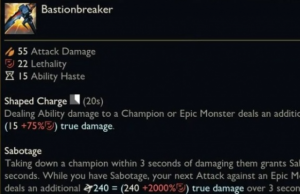 你過去三秒內(nèi)傷害過的敵方英雄死亡會(huì)為你提供一個(gè)破壞效果,你對(duì)史詩級(jí)野怪或者防御塔的下一次攻擊會(huì)消耗掉這個(gè)效果,造成基于穿甲的額外持續(xù)傷害