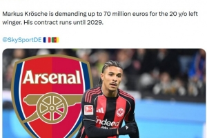 報(bào)道稱阿森納已經(jīng)明確展現(xiàn)出對(duì)這位20歲左邊鋒的興趣,有意在夏窗引進(jìn),法蘭克福也對(duì)此已經(jīng)知悉。法蘭克福體育總監(jiān)馬克爾斯·克羅斯切對(duì)球員要求高達(dá)7000萬(wàn)歐元的轉(zhuǎn)會(huì)費(fèi)。