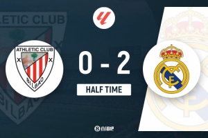 上半場傷停補(bǔ)時2分鐘,半場結(jié)束,皇馬暫2-0畢爾巴鄂競技。