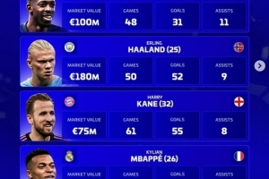 哈蘭德(曼城,25歲,挪威):身價1.8億歐,50場,52球,9助攻