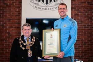本周,布萊斯市市長(zhǎng)戴維·斯溫霍議員前往紐卡斯?fàn)柭?lián)隊(duì)訓(xùn)練基地,為丹·伯恩頒發(fā)了這項(xiàng)殊榮——布萊斯市最高公民獎(jiǎng)——以表彰他在聯(lián)賽杯決賽中為紐卡斯?fàn)柭?lián)做出的卓越貢獻(xiàn)。