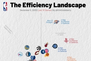 橫軸代表進攻效率,越靠右越好,縱軸代表防守效率,越靠上越強。第一象限的球隊多為發(fā)揮出色的球隊,而在第三象限的球隊通常為戰(zhàn)績比較糟糕的球隊。