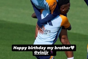 貝林厄姆社媒配文寫道:“祝我的兄弟維尼修斯生日快樂!”