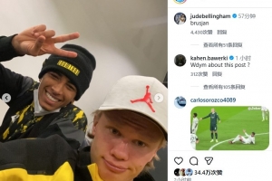 體育資訊12月13日訊 哈蘭德更新社媒,曬出自己和貝林厄姆的合照。貝林厄姆則評論回復:老鐵。