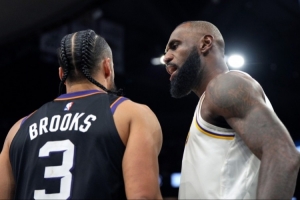 考慮到布魯克斯上次交手后針對勒布朗和湖人發(fā)表的言論,你本該預(yù)料到?jīng)_突會很早發(fā)生。通常情況下勒布朗會無視布魯克斯,但這個周日非比尋常,沖突在上半場升級,導(dǎo)致勒布朗在對位布魯克斯時領(lǐng)到了一次進(jìn)攻犯規(guī)。