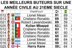 在21世紀自然年進球榜上,姆巴佩63球的成績已經(jīng)超越2012年的C羅來到第4。在2025年皇馬僅剩2場比賽,想達到2013年C羅、2021年萊萬的69球已經(jīng)幾乎不可能。在這份榜單的榜首,2012年梅西的91球仍遙不可及。