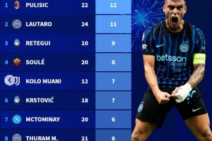 1.普利西奇(米蘭) 22場(chǎng)進(jìn)12球