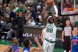 真神了!阿努諾比反擊順步突破 對抗科內(nèi)特單手高難度打板上籃!
