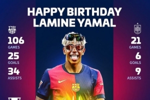 《轉(zhuǎn)會市場》便列出了亞馬爾生涯至今的成就:為巴薩俱樂部106場貢獻25球34助攻,隨隊贏得了2座西甲、1座西超杯、1座國王杯;為西班牙隊21場貢獻6球9助攻,隨隊贏得了2024歐洲杯。