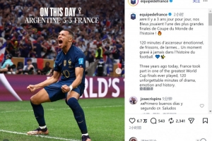 法國(guó)隊(duì)官方社媒曬出姆巴佩慶祝進(jìn)球的照片,配文:“3年前的今天,法國(guó)隊(duì)參加了史上最精彩的世界杯決賽之一。那是120分鐘令人難忘的戲劇性、情感與歷史時(shí)刻的交織?!?/p>