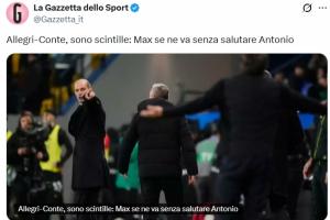 比賽結(jié)束后,阿萊格里徑直走回更衣室,未與孔蒂握手致意??椎賱t留在場上向?qū)κ种乱猓c阿萊格里的長期助手馬爾科·蘭杜奇以及米蘭球員們握了手。