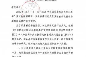 2025年12月7日,在“2025年中國業(yè)余高爾夫球冠軍賽”第四輪比賽期間,發(fā)生參賽運動員及其球童在比賽中串通修改成績的惡劣情況。