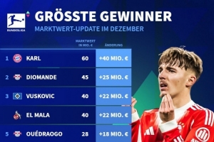體育資訊12月19日訊 德國(guó)轉(zhuǎn)會(huì)市場(chǎng)列出了德甲球員身價(jià)上漲排名,卡爾上漲4000萬(wàn)歐居首。