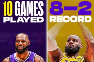 詹姆斯復(fù)出之后,湖人取得8勝2負的戰(zhàn)績,他個人的表現(xiàn)也逐漸提升。復(fù)出前五場比賽,詹姆斯場均出戰(zhàn)32.3分鐘拿到15.2分4.0籃板7.0助攻,三項命中率46/33/52%;后五場場均35.8分鐘砍下22.0分7.8籃板7.6助攻,命中率50/37/82%。