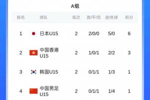 A組積分榜,日本U15兩連勝進5球0失球小組第一,中國香港U15兩場1勝1負(fù)第二,韓國U15兩場1負(fù)1平第三,國少兩場1負(fù)1平進1球丟4球繼續(xù)墊底。