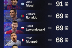 據(jù)Sofascore統(tǒng)計(jì),姆巴佩2025年俱樂(lè)部+國(guó)家隊(duì)總計(jì)打進(jìn)66球,本世紀(jì)自然年進(jìn)球第四多。