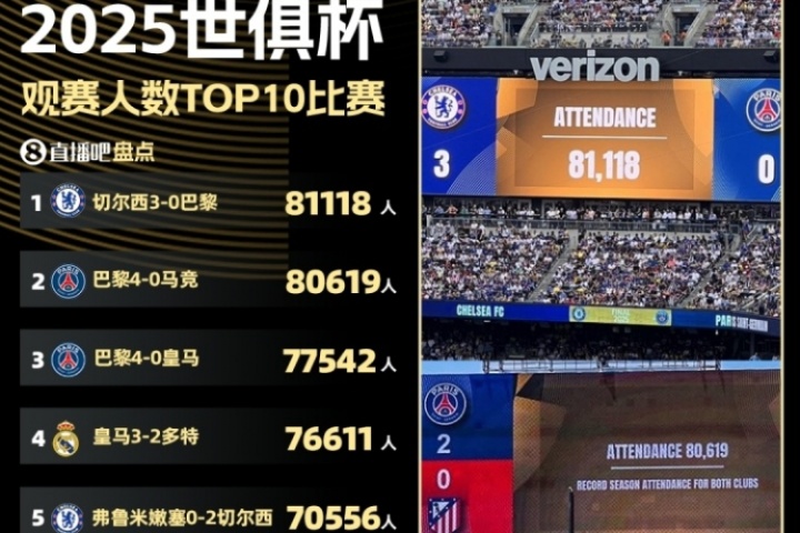 巴黎4-0大勝馬競的比賽觀眾數(shù)也突破8萬人,觀眾數(shù)前十的比賽也均超過6萬人。