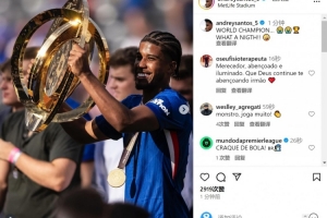 安德烈-桑托斯社媒曬出舉起獎(jiǎng)杯的照片,配文:“世界冠軍,多么美妙的夜晚!”