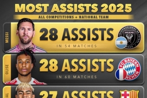以下是2025年年度助攻榜單(俱樂部+國家隊(duì)各項(xiàng)賽事):