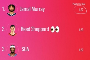 體育資訊12月22日訊 數(shù)據(jù)專家Kirk Goldsberry曬出了本賽季至今平均每次跳投得分最多的球員榜單,具體如下:
