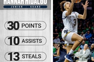 圣母大學(xué)球員漢娜·伊達(dá)爾戈出場22分鐘,拿到了30分5籃板10助攻13搶斷的三雙數(shù)據(jù)。