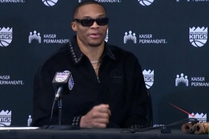 賽后,威少戴著墨鏡參加新聞發(fā)布會(huì),看起來心情很不錯(cuò),他貌似還帶著一節(jié)雙節(jié)棍參加發(fā)布會(huì),當(dāng)記者問這是不是雙節(jié)棍時(shí),威少笑了笑沒有回答,繼續(xù)接受采訪。