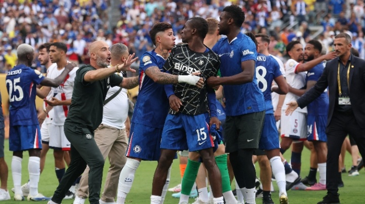 世俱杯賽后,切爾西與巴黎起沖突,杰克遜想要上前干架,被恩佐、馬雷斯卡、巴迪亞西勒攔住。