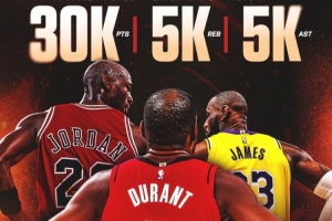 體育資訊12月24日訊 在昨天和國王的比賽中,杜蘭特拿到了個人的第5000次助攻,達成了個人30000分、5000籃板、5000助攻的里程碑。他是NBA歷史上第六位、同時也是第三快達成此成就的球員(1147場比賽,僅次于喬丹960場和詹姆斯1107場)。