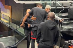 賽前,比爾與杜蘭特擁抱致意,兩人在太陽做過隊友。