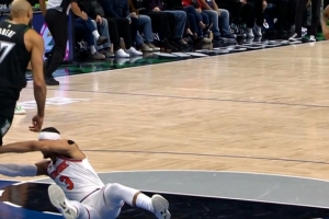 GIF-戈貝爾和哈特?fù)尰@板對(duì)抗激烈 哈特倒地后扒拉了一下戈貝爾膝蓋引發(fā)沖突