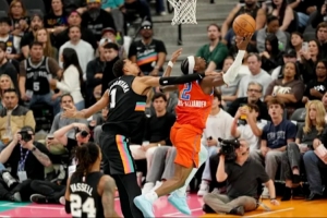 與馬刺的二番戰(zhàn)也在復(fù)現(xiàn)一些之前管用的內(nèi)容。文班亞馬只要站在底角與油漆區(qū)之間的位置,他就能覆蓋護(hù)筐和弱側(cè)的投籃干擾,這其實(shí)等于廢掉了雷霆陣地戰(zhàn)進(jìn)攻的一半場地,而馬刺領(lǐng)防人會(huì)把雷霆持球人往這一半場地送。SGA和杰倫在文班的防區(qū)難有作為,文班很容易就能形成干擾。