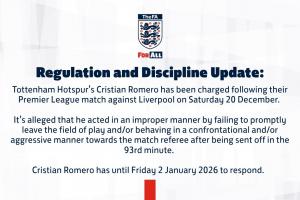 托特納姆熱刺的克里斯蒂安?羅梅羅,在12月20日(周六)對(duì)陣?yán)锲值挠⒊?lián)賽賽后被指控。