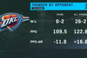 雷霆本賽季對(duì)陣馬刺戰(zhàn)績(jī)0-2,場(chǎng)均僅109.5分,場(chǎng)均凈負(fù)11分