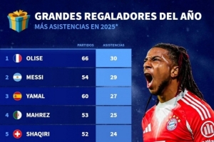 2025年俱樂部+國(guó)家隊(duì)助攻榜:奧利塞30助居首,梅西29助次席
