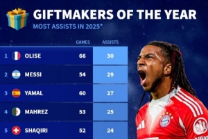 2025年度助攻榜:奧利塞66場30次居首,梅西54場29次第二