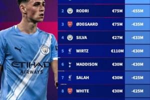 英超球員今年身價(jià)下跌榜:福登跌6000萬(wàn)歐、羅德里跌5500萬(wàn)歐前二