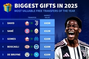 體育資訊12月26日訊 德國(guó)轉(zhuǎn)會(huì)市場(chǎng)統(tǒng)計(jì)了2025年自由身轉(zhuǎn)會(huì)球員的身價(jià),并列出榜單,戴維4500萬歐居首。