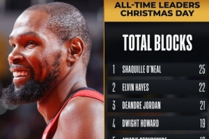 在本場比賽過后,杜蘭特(16)在圣誕大戰(zhàn)蓋帽榜上升至并列第五,詹姆斯(14)上升至第八。