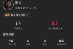 海文本場數據:8次解圍1次搶斷2次對抗全成功,評分7.4分